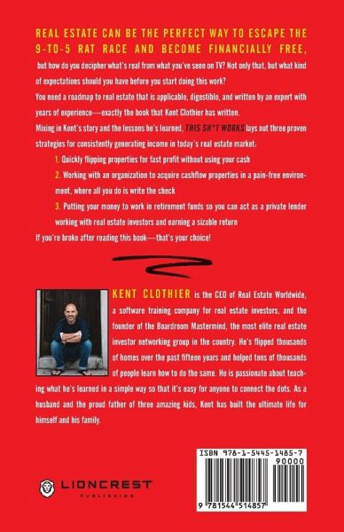 Real estate can be the perfect way to escape the 9-to-5 rat race and become financially free, but how do you decipher what's real from what you've seen on TV? Not only that, but what kind of expectations should you have before you start doing this work? You need a roadmap to real estate that is applicable, digestible, and written by an expert with years of experience-exactly the book that Kent Clothier has written. Mixing in Kent's story and the lessons he's learned, This Sh*t Works lays out three proven strategies for consistently generating income in today's real estate market: 1. Quickly flipping properties for fast profit without using your cash 2. Working with an organization to acquire cashflow properties in a pain-free environment, where all you do is write the check 3. Putting your money to work in retirement funds so you can act as a private lender working with real estate investors and earning a sizable return If you're broke after reading this book-that's your choice!