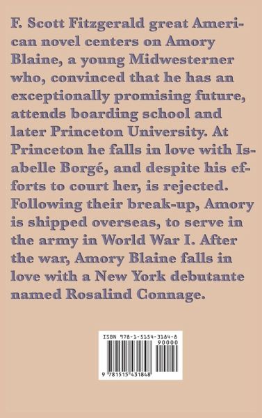 F. Scott Fitzgerald great American novel centers on Amory Blaine, a young Midwesterner who, convinced that he has an exceptionally promising future, attends boarding school and later Princeton University. At Princeton he falls in love with Isabelle Borgé, and despite his efforts to court her, is rejected. Following their break-up, Amory is shipped overseas, to serve in the army in World War I. After the war, Amory Blaine falls in love with a New York debutante named Rosalind Connage.