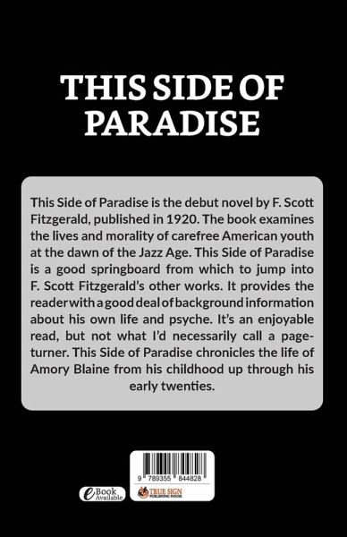This Side of Paradise is the debut novel by F. Scott Fitzgerald, published in 1920. The book examines the lives and morality of carefree American youth at the dawn of the Jazz Age. This Side of Paradise is a good springboard from which to jump into F. Scott Fitzgerald's other works. It provides the reader with a good deal of background information about his own life and psyche. It's an enjoyable read, but not what I'd necessarily call a page-turner. This Side of Paradise chronicles the life of Amory Blaine from his childhood up through his early twenties.