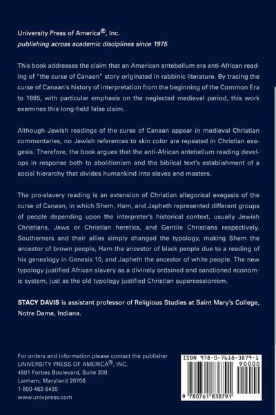 This book addresses the claim that an American antebellum era anti-African reading of "the curse of Canaan" story originated in rabbinic literature. By tracing the curse of Canaan's history of interpretation from the beginning of the Common Era to 1865, with particular emphasis on the neglected medieval period, this work examines this long-held false claim. Although Jewish readings of the curse of Canaan appear in medieval Christian commentaries, no Jewish references to skin color are repeated in Christian exegesis. Therefore, the book argues that the anti-African antebellum reading develops in response both to abolitionism and the biblical text's establishment of a social hierarchy that divides humankind into slaves and masters. The pro-slavery reading is an extension of Christian allegorical exegesis of the curse of Canaan, in which Shem, Ham, and Japheth represented different groups of people depending upon the interpreter's historical context, usually Jewish Christians, Jews or Christian heretics, and Gentile Christians respectively. Southerners and their allies simply changed the typology, making Shem the ancestor of brown people, Ham the ancestor of black people due to a reading of his genealogy in Genesis 10, and Japheth the ancestor of white people. The new typology justified African slavery as a divinely ordained and sanctioned economic system, just as the old typology justified Christian supersessionism.