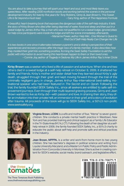 You are about to take a journey that will spark your heart and soul, and most likely leave you speechless. After reading 2200 nonfiction books and working behind the scenes in the personal development industry for twenty-five years for Tony Robbins, Ginny & Jean Brown's, This Sweet Life is far beyond a must read. ~Gary King, author of The Happiness Formula A beautiful, heart-breaking book that exposes the dangerous side of the self-help industry. It tells the story of Kirby Brown who died after being deprived of water, food and sleep and then put in a sweat lodge by James Arthur Ray, a man who was not qualified to run a sweat lodge, ignored pleas for help once participants were inside the lodge and left the scene immediately afterwards. ~Marianne Power, author Help Me!... One Woman's Quest to Find Out if Self-Help Really Can Change Her Life It is two books in one since it alternates between a parent's and a sibling's perspective of their experiences and recovery process after the tragic loss of a family member. It also describes how they molded their grief into something positive, forming the Seek Safely Foundation to aid the public with information to avoid having this heartbreak happen to them or their loved ones. ~Connie Joy, author of Tragedy in Sedona: My Life in James Arthur Ray's Inner Circle James Arthur Ray wrote his own memoir of what happened in Sedona, and it reads like a marketing tool- which is exactly what he intended. Ginny and Jean's book is vastly different from James's account, not just in perspective, but in the depth of its authenticity. In the end, this is not a book about blame. It's a book about responsibility. Their story is raw, honest...and, like Kirby, hopeful. ~Dr. Glenn Doyle, psychologist, author Wish I'd Known That Kirby Brown was a seeker who lived a life of passion and adventure. When she and two others died in a sweat lodge at a self-help retreat on October 8, 2009, it shattered her family and friends. Kirby's mother and sister detail how they learned about Kirby's ugly death, struggled through their grief, and kept moving forward through the trial of the criminally negligent guru in charge, James Arthur Ray-international best-selling motivational speaker who had been featured in "The Secret" and on Oprah. Following the trial, the family founded SEEK Safely Inc., since all seekers are entitled to safe self-improvement journeys. Even through their multi-layered grieving process, Ginny and Jean Brown wanted to live as Kirby did-with passion and love. In sharing their story, they offer an invitation into their private hell, an immersion in their grief, and a story of evolution after trauma.