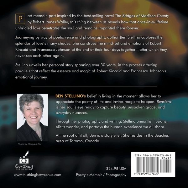 Part memoir, part inspired by the best-selling novel The Bridges of Madison County by Robert James Waller, this thing between us reveals how that once-in-a-lifetime unbridled love penetrates the soul and remains imprinted there forever. Journeying by way of poetic verse and photography, author Ben Stellino captures the splendor of love's many shades. She construes the mind-set and emotions of Robert Kincaid and Francesca Johnson at the end of their four days together-after which they never see each other again. Stellino unveils her personal story spanning over 30 years, in the process drawing parallels that reflect the essence and magic of Robert Kincaid and Francesca Johnson's emotional journey.