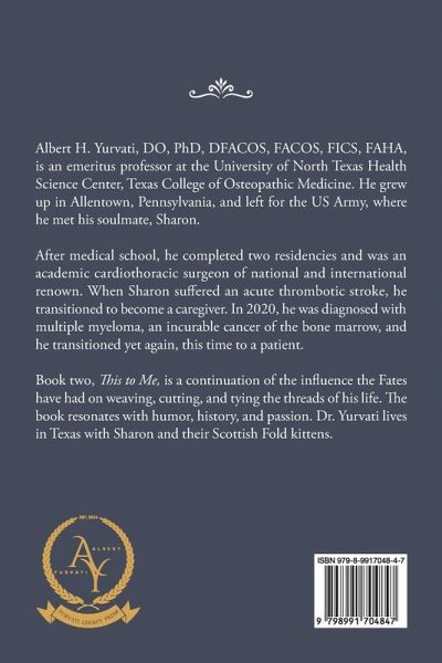 Autobiography: Albert H. Yurvati, DO, PhD, DFACOS, FACOS, FICS, FAHA, is an emeritus professor at the University of North Texas Health Science Center, Texas College of Osteopathic Medicine. He grew up in Allentown, Pennsylvania, and left for the US Army, where he met his soulmate, Sharon.After medical school, he completed two residencies and was an academic cardiothoracic surgeon of national and international renown. When Sharon suffered an acute thrombotic stroke, he transitioned to become a caregiver. In 2020, he was diagnosed with multiple myeloma, an incurable cancer of the bone marrow, and he transitioned yet again, this time to a patient.Book two, This to Me, is a continuation of the influence the Fates have had on weaving, cutting, and tying the threads of his life. The book resonates with humor, history, and passion. Dr. Yurvati lives in Texas with Sharon and their Scottish Fold kittens.