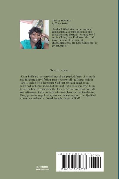 This To Shall Pass! Is a Book filled with true accounts of compilations and compositions of encounters and triumph of learning whom , I have become in Christ Jesus . Real issues that took place. Because of the past hurt and trials of true concerns. Scars that were hidden for a long time. That will help you understand that , after standing strong through it all. Jesus will make it known to others you are more than a conqueror. From the Pit that others tried to place me in.