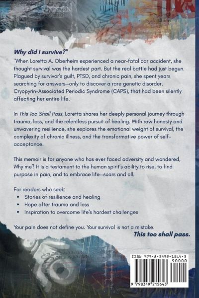 This Too Shall Pass: A Memoir of Survival, Loss, and Finding Purpose By Loretta A. Oberheim A powerful and deeply personal memoir, This Too Shall Pass chronicles one woman's journey through trauma, grief, and the relentless pursuit of healing. After a near-fatal car accident, Loretta A. Oberheim was left not only with physical scars but an emotional battle that tested her sense of self and purpose. What followed was a years-long struggle with survivor's guilt, chronic illness, and the weight of unanswered questions-until she found the courage to embrace life again. Through raw honesty and profound storytelling, Oberheim shares the moments that broke her, the unexpected diagnoses that reshaped her future, and the resilience that carried her forward. From navigating PTSD to uncovering a rare genetic disorder, her story is a testament to the strength of the human spirit. This memoir is for anyone who has ever faced adversity, questioned their own survival, or searched for meaning in the midst of suffering. This Too Shall Pass is more than a story of survival-it's an invitation to embrace hope, rediscover purpose, and find beauty in life's most difficult moments. Perfect for readers who enjoy: ¿¿ Inspirational true stories ¿¿ Memoirs of resilience and healing ¿¿ Stories about overcoming trauma and chronic illness Order your copy today and take the first step toward healing, hope, and self-discovery.
