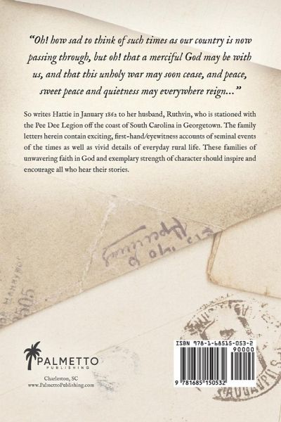 "Oh! how sad to think of such times as our country is now passing through, but oh! that a merciful God may be with us, and that this unholy war may soon cease, and peace, sweet peace and quietness may everywhere reign..." So writes Hattie in January 1862 to the love of her life, husband Ruthvin, who is stationed with the Pee Dee Legion ö the coast of South Carolina in Georgetown. Letters from the Rogers, Plowden, Mood, and Haynesworth families, among others herein contain exciting, ¿rst-hand/eyewitness accounts of seminal events of the times, such as the great Charleston fire, the beginning attack on Ft. Sumter, and Potter's Raid, as well as vivid details of everyday rural life. Their true examples of unwavering faith in God and exemplary strength of character should inspire and encourage all who hear their stories. Cherished by the family and protected over many long years, these 300+ epistles are much more than accounts of battles and the "War of Northern Aggression." They are a glimpse back into a time that is no more, but which vividly lives on in these pages.