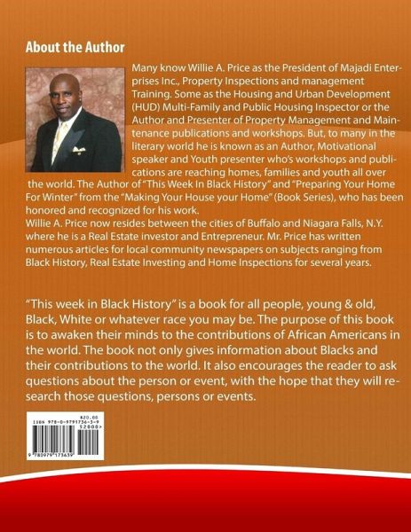 This Week in Black History is a book written for people from all walks of life. You may be young, old, black or white. The purpose of this book is to awaken peoples mind to the contributions of African Americans in the world. The book not only gives information about Blacks and their contributions to the world, it also encourages the reader to ask questions about the person or event, with the hope that they will research those questions, persons or events. This book is a way to bring a new perspective and ideology to all Americans regardless of their race, creed, color or economic background.