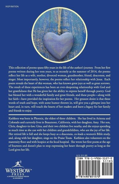 This collection of poems spans fifty years in the life of the author's journey. From her first poems written during her teen years, to as recently as the summer of 2014, the poems reflect her life as a wife, mother, divorced woman, grandmother, friend, deaconess, and singer. Most importantly, however, the poems reflect her relationship with Jesus. Each poem reveals the heart of this woman, who has known great joys as well as great sorrows. The result of these experiences has been an ever-deepening relationship with God and her gratefulness that He has given her the ability to express herself through poetry. God has blessed her with a wonderful family and great friends, and these people-along with her faith-have provided the inspiration for her poems. Her greatest desire is that these words of truth and hope, with some humor thrown in, will give you a glimpse into her heart and, in turn, will touch the hearts of her readers and leave a legacy for her family and friends to enjoy.