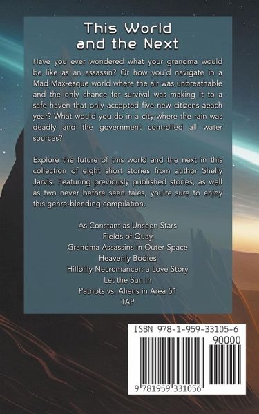 Have you ever wondered what your grandma would be like as an assassin? Or how you'd navigate in a Mad Max-esque world where the air was unbreathable and the only chance for survival was making it to a safe haven that only accepted five new citizens aeach year? What would you do in a city where the rain was deadly and the government controlled all water sources? Explore the future of this world and the next in this collection of eight short stories from author Shelly Jarvis. Featuring previously published stories, as well as two never before seen tales, you're sure to enjoy this genre-blending compilation.As Constant as Unseen Stars Fields of Quay Grandma Assassins in Outer Space Heavenly Bodies Hillbilly Necromancer: a Love Story Let the Sun In Patriots vs. Aliens in Area 51 TAP