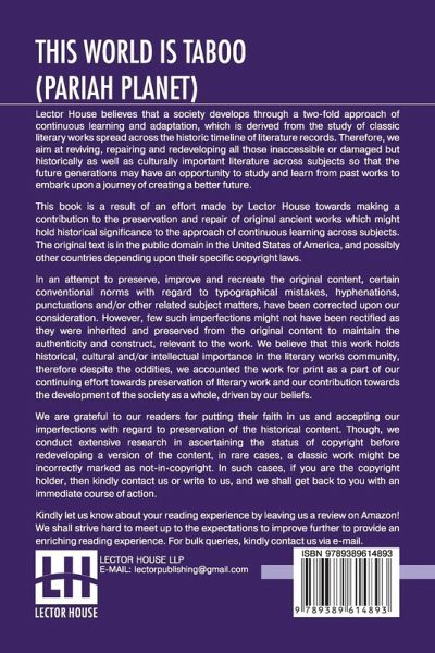 This World Is Taboo (Pariah Planet): Complete Book-Length Novel This book is a result of an effort made by us towards making a contribution to the preservation and repair of original classic literature. In an attempt to preserve, improve and recreate the original content, we have worked towards: 1. Type-setting & Reformatting: The complete work has been re-designed via professional layout, formatting and type-setting tools to re-create the same edition with rich typography, graphics, high quality images, and table elements, giving our readers the feel of holding a 'fresh and newly' reprinted and/or revised edition, as opposed to other scanned & printed (Optical Character Recognition - OCR) reproductions. 2. Correction of imperfections: As the work was re-created from the scratch, therefore, it was vetted to rectify certain conventional norms with regard to typographical mistakes, hyphenations, punctuations, blurred images, missing content/pages, and/or other related subject matters, upon our consideration. Every attempt was made to rectify the imperfections related to omitted constructs in the original edition via other references. However, a few of such imperfections which could not be rectified due to intentional\unintentional omission of content in the original edition, were inherited and preserved from the original work to maintain the authenticity and construct, relevant to the work. We believe that this work holds historical, cultural and/or intellectual importance in the literary works community, therefore despite the oddities, we accounted the work for print as a part of our continuing effort towards preservation of literary work and our contribution towards the development of the society as a whole, driven by our beliefs. We are grateful to our readers for putting their faith in us and accepting our imperfections with regard to preservation of the historical content. HAPPY READING!