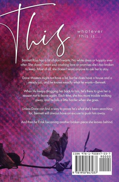 Whatever this is... Bennett Ross has a list of don't-wants. No white dress or happily ever after. She doesn't want soul-crushing love or promises she's too broken to keep. Most of all, she doesn't want anyone to ask her to stay. Dane Masters might not have a list, but he does have a house and a steady job, and he knows exactly what he wants-Bennett. When life keeps dragging her back to him, he's there to give her a reason not to leave again. Each time, she has more trouble walking away, and he falls a little harder when she goes. She has more trouble walking away every time. Unless Dane can find a way to prove he's what she's been searching for, Bennett will always have an excuse to push him away. And then he'll risk becoming another broken piece she leaves behind. A stand alone new adult romance.