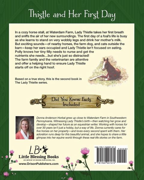 In a cozy horse stall, at Waterdam Farm, Lady Thistle takes her first breath and sniffs the air of her new surroundings. The first day of a foal's life is busy as she learns to stand on very wobbly legs and drink her mother's milk. But exciting sounds-of nearby horses, the farm dog, and cats outside the barn-keep her ears occupied and Lady Thistle isn't focused on eating. Polly knows her tiny filly needs to nurse and get the nutrients she needs...but she's just so distracted! The farm family and the veterinarian are attentive and offer a helping hand to ensure Lady Thistle starts off on the right hoof. Based on a true story, this is the second book in The Lady Thistle series.