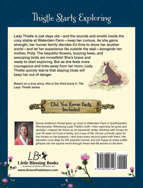 Lady Thistle is just days old-and the sounds and smells inside the cozy stable at Waterdam Farm-keep her curious. As she gains strength, her human family decides it's time to show her another world-and let her experience life outside the stall-alongside her mother, Polly. The beautiful flowers, buzzing bees, and swooping birds are incredible! She's brave and ready to start exploring. But as she feels more courageous and trots away from her mom, Lady Thistle quickly learns that staying close will keep her out of danger. Based on a true story, this is the third book in The Lady Thistle series.