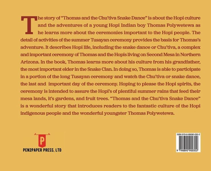 The story of "Thomas and the Chu'tiva Snake Dance" is about the Hopi culture and the adventures of a young Hopi Indian boy Thomas Polywetewa as he learns more about the ceremonies important to the Hopi people. The detail of activities of the summer Tusayan ceremony provides the basis for Thomas's adventure. It describes Hopi life, including the snake dance or Chu'tiva, a complex and important ceremony of Thomas and the Hopis living on Second Mesa in Northern Arizona. In the book, Thomas learns more about his culture from his grandfather, the most important elder in the Snake Clan. In doing so, Thomas is able to participate in a portion of the long Tusayan ceremony and watch the Chu'tiva or snake dance, the last and important day of the ceremony. Hoping to please the Hopi spirits, the ceremony is intended to assure the Hopi's of plentiful summer rains that feed their mesa lands, it's gardens, and fruit trees. "Thomas and the Chu'tiva Snake Dance" is a wonderful story that introduces readers to the fantastic culture of the Hopi indigenous people and the wonderful youngster Thomas Polywetewa.