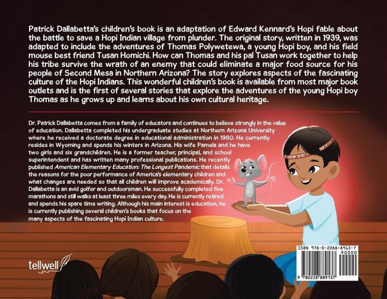 Patrick Dallabetta's children's book is an adaptation of Edward Kennard's Hopi fable about the battle to save a Hopi Indian village from plunder. The original story, written in 1939, was adapted to include the adventures of Thomas Polywetewa, a young Hopi boy, and his field mouse best friend Tusan Homichi. How can Thomas and his pal Tusan work together to help his tribe survive the wrath of an enemy that could eliminate a major food source for his people of Second Mesa in Northern Arizona? The story explores aspects of the fascinating culture of the Hopi Indians. This wonderful children's book is available from most major book outlets and is the first of several stories that explore the adventures of the young Hopi boy Thomas as he grows up and learns about his own cultural heritage.