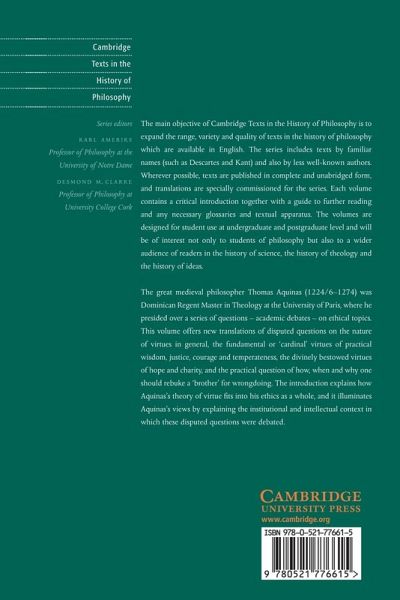 The great medieval philosopher Thomas Aquinas (1224/6-1274) was Dominican regent master in theology at the University of Paris, where he presided over a series of questions - academic debates - on ethical topics. This volume offers translations of disputed questions on the nature of virtues in general, the fundamental or 'cardinal' virtues of practical wisdom, justice, courage, and temperateness, the divinely bestowed virtues of hope and charity, and the practical question of how, when and why one should rebuke a 'brother' for wrongdoing. The introduction explains how Aquinas's theory of virtue fits into his ethics as a whole, and it illuminates Aquinas's views by explaining the institutional and intellectual context in which these disputed questions were debated.