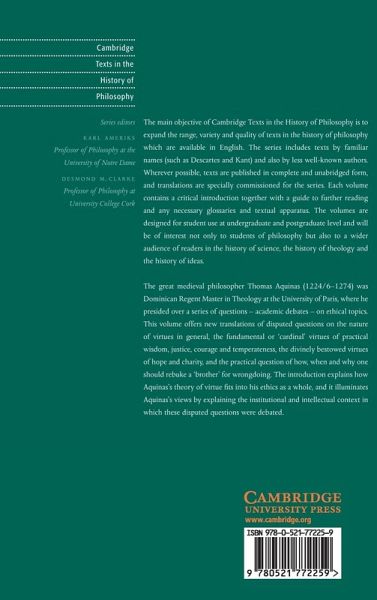 The great medieval philosopher Thomas Aquinas (1224/6-1274) was Dominican regent master in theology at the University of Paris, where he presided over a series of questions - academic debates - on ethical topics. This volume offers translations of disputed questions on the nature of virtues in general, the fundamental or 'cardinal' virtues of practical wisdom, justice, courage, and temperateness, the divinely bestowed virtues of hope and charity, and the practical question of how, when and why one should rebuke a 'brother' for wrongdoing. The introduction explains how Aquinas's theory of virtue fits into his ethics as a whole, and it illuminates Aquinas's views by explaining the institutional and intellectual context in which these disputed questions were debated.