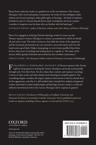* Preface * 1. Setting the Summa Theologiae * 2. Sacred Teaching (1a 1) * 3. Knowing That God Exists (1a 1 2) * 4. The Divine Nature: Part 1 (1a 3-13) * 5. The Divine Nature: Part 2 (1a 14-26) * 6. The Divine Trinity (1a 27-43) * 7. Creation Good and Evil (1a 44-49) * 8. Angels and the Days of Creation (1a 50-74) * 9. Human Beings and Divine Government (1a 75-119) * 10. Happiness Human Action and Morality (1a2ae 1-21) * 11. Emotions (1a2ae 22-48) * 12. Dispositions Virtues Gifts Beatitudes and Fruits (1a2ae 49-70) * 13. Sin (1a2ae 71-85) * 14. Law Old Law New Law and Grace (1a2ae 90-114) * 15. Faith Hope and Charity (2a2ae 1-46) * 16. Prudence Justice and Injustice (2a2ae 47-79) * 17. Religion and Other Matters to do With Justice (2a2ae 80-122) * 18. Courage and Temperance (2a2ae 123-170) * 19. Freely Given Graces Kinds of Life and States of Life (2a2ae 171-189) * 20. God Incarnate (3a 1-26) * 21. The Life Death Resurrection and Ascension of Christ (3a 27-59) * 22. The Sacraments of the Christian Church (3a 60-90) * 23. Epilogue * Appendix: The Summa Theologiae at a Glance * Bibliography * Index