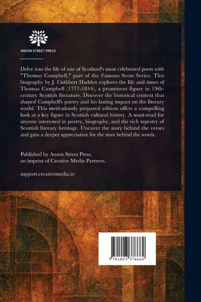 Delve into the life of one of Scotland's most celebrated poets with "Thomas Campbell," part of the Famous Scots Series. This biography by J. Cuthbert Hadden explores the life and times of Thomas Campbell (1777-1844), a prominent figure in 19th-century Scottish literature. Discover the historical context that shaped Campbell's poetry and his lasting impact on the literary world. This meticulously prepared edition offers a compelling look at a key figure in Scottish cultural history. A must-read for anyone interested in poetry, biography, and the rich tapestry of Scottish literary heritage. Uncover the story behind the verses and gain a deeper appreciation for the man behind the words. This work has been selected by scholars as being culturally important, and is part of the knowledge base of civilization as we know it. This work is in the public domain in the United States of America, and possibly other nations. Within the United States, you may freely copy and distribute this work, as no entity (individual or corporate) has a copyright on the body of the work. Scholars believe, and we concur, that this work is important enough to be preserved, reproduced, and made generally available to the public. We appreciate your support of the preservation process, and thank you for being an important part of keeping this knowledge alive and relevant.