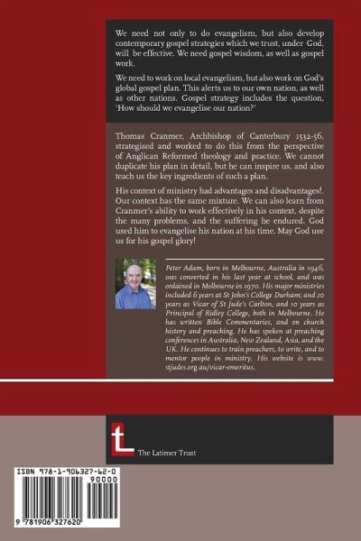 We need not only to do evangelism, but also develop contemporary gospel strategies which we trust, under God, will be effective. We need gospel wisdom, as well as gospel work. We need to work on local evangelism, but also work on God's global gospel plan. This alerts us to our own nation, as well as other nations. Gospel strategy includes the question, 'How should we evangelise our nation?' Thomas Cranmer, Archbishop of Canterbury 1532-56, strategised and worked to do this from the perspective of Anglican Reformed theology and practice. We cannot duplicate his plan in detail, but he can inspire us, and also teach us the key ingredients of such a plan. His context of ministry had advantages and disadvantages!. Our context has the same mixture. We can also learn from Cranmer's ability to work effectively in his context, despite the many problems, and the suffering he endured. God used him to evangelise his nation at his time. May God use us for his gospel glory!