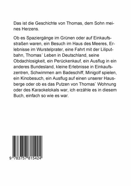 Thomas - eine besondere LiebesgeschichteDas ist die Geschichte von Thomas, dem Sohn meines Herzens. Ob es Spaziergänge im Grünen oder auf Einkaufs-straßen waren, ein Besuch im Haus des Meeres, Erlebnisse im Wurstelprater, eine Fahrt mit der Lili-putbahn, Thomas´ Leben in Deutschland, seine Obdachlosigkeit, ein Perückenkauf, ein Ausflug in ein anderes Bundesland, kleine Erlebnisse in Ein-kaufszentren, Schwimmen am Badeschiff, Minigolf spielen, ein Kinobesuch, ein Ausflug auf einen un-serer Hausberge oder ob es das Putzen von Thomas` Wohnung oder des Karaokelokals war, ich erzähle es in diesem Buch, einfach so wie es war.