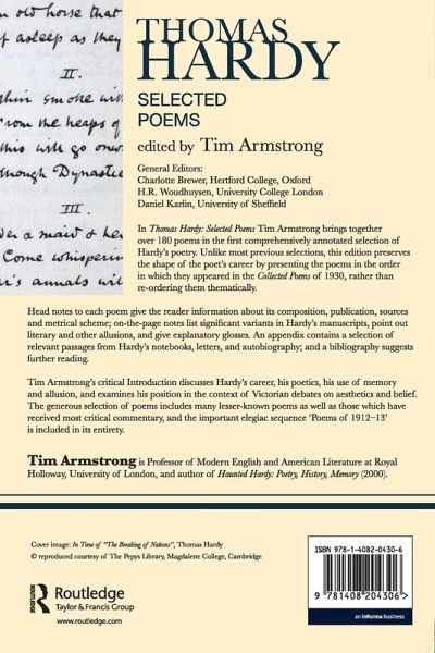 In Thomas Hardy: Selected Poems Tim Armstrong brings together over 180 poems in the first comprehensively annotated selection of Hardy?s poetry. Unlike most previous selections, this edition preserves the shape of the poet?s career by presenting the poems in the order in which they appeared in the Collected Poems of 1930, rather than re-ordering them thematically.