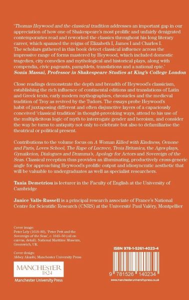 This collection offers a groundbreaking study of Thomas Heywoodâ s fascinatingly individual engagement with the classics across his writing career. It considers the wide diversity of genres to which he contributed, including dramas, translations, compendia, and iconographical designs, and attends to the shaping role of classics in his authorial self-fashioning and idiosyncratic aesthetic. -- .