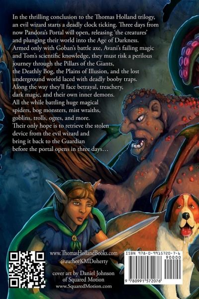 What do you do when your friends need you to help save the world? Only problem is-you're not on their world. You're not even in the same universe! Well, that's how book three in the trilogy starts off. What's more, in book three, the stakes are far higher. If they screw this one up, everyone might die at the claws of life-force sucking creatures from the forbidden planet! The trilling conclusion provides even more of what the series fans have been asking for: the same beloved characters, but with more excitement, more suspense, bigger laughs, real tears, along with surprise twist after surprise twist. Book three in the epic trilogy really pushes all the characters to, and sometimes past their limits, both in their world as well as inside their hearts and minds. Armed only with Goban's battle axe, Avani's failing magic and Tom's scientific knowledge, the heroes must risk a perilous journey through the Pillars of the Giants, the Deathly Bog, the Plains of Illusion, and the lost underground world laced with deadly booby traps. Along the way they'll face betrayal, treachery, dark magic, and their own inner demons. All the while battling huge magical spiders, bog monsters, mist wraiths, goblins, trolls, ogres, and more. Their only hope, is to retrieve the stolen device from the evil wizard and bring it back to the Guardian before the portal opens in three days... The Award-Winning series concludes with: "Thomas Holland and Pandora's Portal." Not only is it an exciting story by itself, the book completes the larger story that wraps around and through all three books connecting the legend and the prophecy with a huge surprise twist near the end. Complete your adventure! Buy it now!