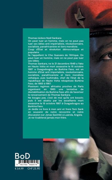 Thomas Isidore Noël SankaraOn peut tuer un homme, mais on ne peut pas tuer ses idées anti impérialiste, révolutionnaire, socialiste, panafricaniste et tiers mondiste. Coup d'État et révolution démocratique et populaireIls l'appellent le Che Guevara de l'Afrique. On peut tuer un homme, mais on ne peut pas tuer ses idées.Thomas Sankara, ne le 21 decembre 1949 a Yako en Haute Volta et mort assassine le 15 octobre 1987 a Ouagadougou au Burkina Faso, est un homme d'Etat anti imperialiste, revolutionnaire, socialiste, panafricaniste et tiers mondiste voltaique, puis burkinabe, chef de l'Etat de la republique de Haute Volta rebaptisee Burkina Faso, de 1983 à 1987. Plusieurs regimes africains proches de Paris organisent en 1985 une tentative de destabilisation du Burkina Faso afin de favoriser le renversement de Thomas Sankara. Ne bougez pas, c'est de moi qu'ils ont besoin; puis il est abattu par les assaillants mort assassine le 15 octobre 1987 à Ouagadougou au Burkina Faso. Je dedie ce livre à mon ami et frere Tom Sank en souvenir de notre rencontre et notre discussion sur Jonas Savimbi a Luanda, Angola. Je ne t'oublierai jamais mon frère.