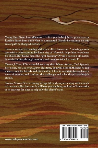 Young Tom Greer has a dilemma. His first year in his job as a private eye in London hasn't been quite what he anticipated. Should he continue on this career path or change direction? Then an unexpected meeting with a new client intervenes. A missing person case with a connection to his home city of Norwich, helps him re-evaluate his choice. But has he made the right decision? Or will a decision ultimately be made for him, through emotions and events outside his control? Thomas J Greer, PI is a standalone story that follows Author, Carl Spence's first novel, The Girl from Jeparit. This time, Tom will need all the help he can muster from his friends and his mentor, if he's to maintain his trademark sense of humour, and confront the challenges and solve the puzzles his job entails. Thomas J Greer, PI is a coming-of-age tale and a mystery story with a touch of romance rolled into one. It will have you laughing out loud at Tom's antics as he searches for clues to help solve his clients' cases.