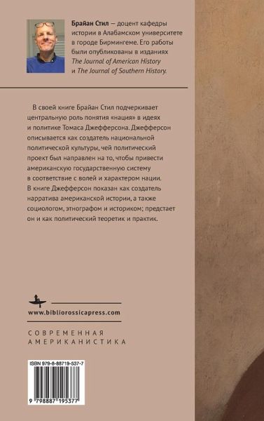 ENG This book emphasizes the centrality of nationhood to Thomas Jefferson's thought and politics, envisioning Jefferson as a cultural nationalist whose political project sought the alignment of the American state system with the will and character of the nation. He appears in the book as the essential narrator of what he once called the "American Story": as the historian, the sociologist, and the ethnographer; the political theorist of the nation; the most successful practitioner of its politics; and its most enthusiastic champion. RUS В своей книге Брайан Стил подчеркивает центральную роль понятия «нация» в идеях и политике Томаса Джефферсона. Джефферсон описывается как создатель национальной политической культуры, чей политический проект был направлен на то, чтобы привести американскую государственную систему в соответствие с волей и характером нации. В книге Джефферсон показан как соз
