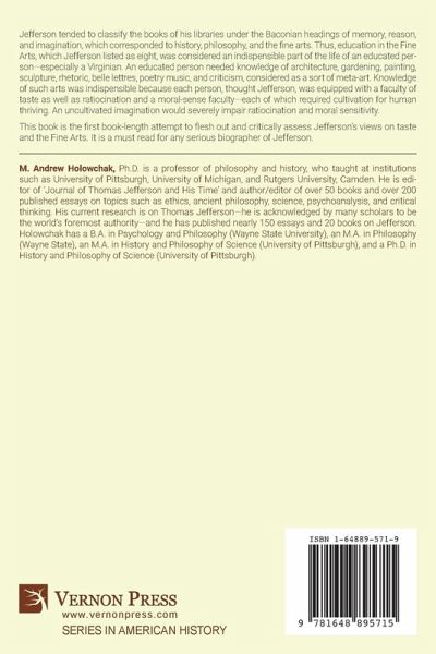 Jefferson tended to classify the books of his libraries under the Baconian headings of memory, reason, and imagination, which corresponded to history, philosophy, and the fine arts. Thus, education in the Fine Arts, which Jefferson listed as eight, was considered an indispensible part of the life of an educated person-especially a Virginian. An educated person needed knowledge of architecture, gardening, painting, sculpture, rhetoric, belle lettres, poetry music, and criticism, considered as a sort of meta-art. Knowledge of such arts was indispensible because each person, thought Jefferson, was equipped with a faculty of taste as well as ratiocination and a moral-sense faculty-each of which required cultivation for human thriving. An uncultivated imagination would severely impair ratiocination and moral sensitivity. This book is the first book-length attempt to flesh out and critically assess Jefferson's views on taste and the Fine Arts. It is a must read for any serious biographer of Jefferson.