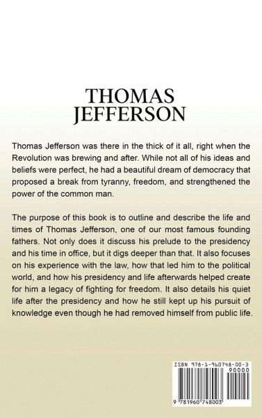 THOMAS JEFFERSON Thomas Jefferson was there in the thick of it all, right when the Revolution was brewing and after. While not all of his ideas and beliefs were perfect, he had a beautiful dream of democracy that proposed a break from tyranny, freedom, and strengthened the power of the common man. The purpose of this book is to outline and describe the life and times of Thomas Jefferson, one of our most famous founding fathers. Not only does it discuss his prelude to the presidency and his time in office, but it digs deeper than that. It also focuses on his experience with the law, how that led him to the political world, and how his presidency and life afterwards helped create for him a legacy of fighting for freedom. It also details his quiet life after the presidency and how he still kept up his pursuit of knowledge even though he had removed himself from public life.