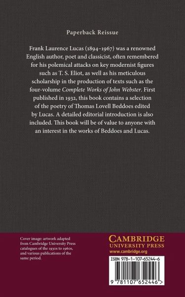 Frank Laurence Lucas (1894-1967) was a renowned English author, poet and classicist, often remembered for his polemical attacks on key modernist figures such as T. S. Eliot, as well as his meticulous scholarship in the production of texts such as the four-volume Complete Works of John Webster. First published in 1932, this book contains a selection of the poetry of Thomas Lovell Beddoes edited by Lucas. A detailed editorial introduction is also included. This book will be of value to anyone with an interest in the works of Beddoes and Lucas.