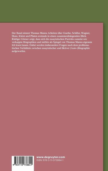 Der Band nimmt Thomas Manns Arbeiten über Goethe, Schiller, Wagner, Shaw, Kleist und Platen erstmals in einen zusammenhängenden Blick. Rüdiger Görner zeigt, dass sich die essayistischen Porträts zumeist wie verkappte Biographien und mithin als Spiegel von Thomas Manns eigenem Ich lesen lassen. Dabei werden insbesondere Fragen nach dem problematischen Verhältnis zwischen essayistischer und fiktiver (Auto-)Biographie aufgeworfen.