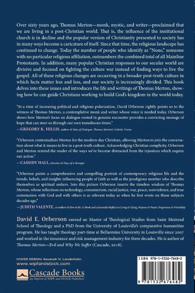 Over sixty years ago, Thomas Merton--monk, mystic, and writer--proclaimed that we are living in a post-Christian world. That is, the influence of the institutional church is in decline and the popular version of Christianity presented to society has in many ways become a caricature of itself. Since that time, the religious landscape has continued to change. Today the number of people who identify as ""None,"" someone with no particular religious affiliation, outnumbers the combined total of all Mainline Protestants. In addition, many popular Christian responses to our secular world are divisive and focused on fighting the culture war instead of finding ways to live the gospel. All of these religious changes are occurring in a broader post-truth culture in which facts matter less and less, and our society is increasingly divided. This book delves into these issues and introduces the life and writings of Thomas Merton, showing how he can guide Christians working to build God's kingdom in the world today.
