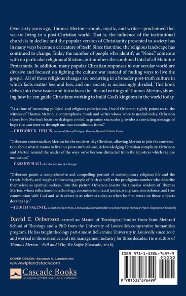 Over sixty years ago, Thomas Merton--monk, mystic, and writer--proclaimed that we are living in a post-Christian world. That is, the influence of the institutional church is in decline and the popular version of Christianity presented to society has in many ways become a caricature of itself. Since that time, the religious landscape has continued to change. Today the number of people who identify as ""None,"" someone with no particular religious affiliation, outnumbers the combined total of all Mainline Protestants. In addition, many popular Christian responses to our secular world are divisive and focused on fighting the culture war instead of finding ways to live the gospel. All of these religious changes are occurring in a broader post-truth culture in which facts matter less and less, and our society is increasingly divided. This book delves into these issues and introduces the life and writings of Thomas Merton, showing how he can guide Christians working to build God's kingdom in the world today.