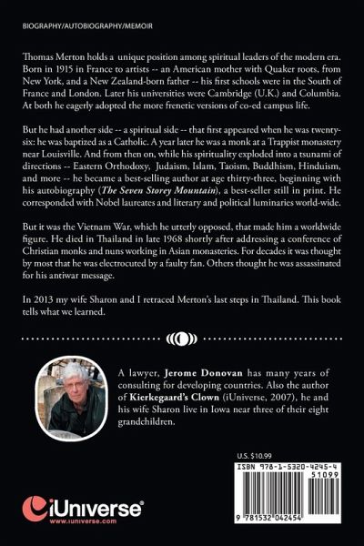 Born in 1915 in France to artists-an American mother with Quaker roots from New York, and a New Zealand-born father-Thomas Merton would become one of the twentieth century's most influential spiritual leaders. Baptized as a Catholic at age twenty-six, he joined a Trappist monastery near Louisville a year later. From that point on, his spiritual side exploded into a tsunami of directions-Eastern Orthodoxy, Judaism, Islam, Taoism, Buddhism, Hinduism, and more. At age thirty-three, he became a best-selling author, beginning with his autobiography, The Seven Storey Mountain. He corresponded with Nobel Prize laureates and other literary and political luminaries. His public opposition to the Vietnam War assured his worldwide celebrity. In late 1968, at the peak of his popularity, Merton died in Thailand after addressing a conference of Western Christian monks and nurses stationed in Asia. For decades it was thought that, wet from a shower, he was electrocuted by a faulty standing fan. But for a growing number of his admirers there were dark suspicions that he might well have been assassinated by those who feared his antiwar message. In 2013 the author and his wife Sharon retraced Merton's last days in Thailand. This book tells what they learned."