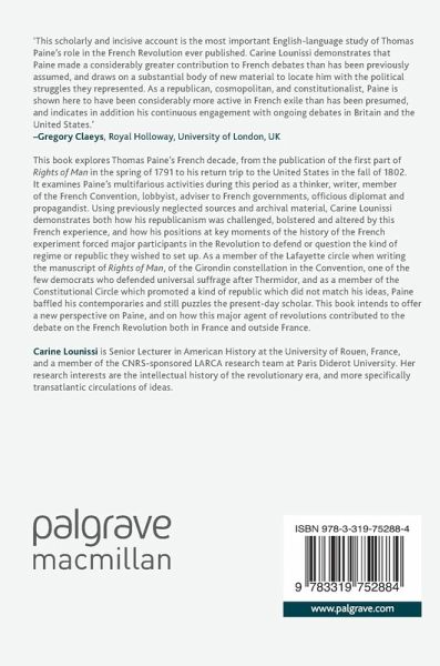 This book explores Thomas Paine's French decade, from the publication of the first part of Rights of Man in the spring of 1791 to his return trip to the United States in the fall of 1802. It examines Paine's multifarious activities during this period as a thinker, writer, member of the French Convention, lobbyist, adviser to French governments, officious diplomat and propagandist. Using previously neglected sources and archival material, Carine Lounissi demonstrates both how his republicanism was challenged, bolstered and altered by this French experience, and how his positions at key moments of the history of the French experiment forced major participants in the Revolution to defend or question the kind of regime or of republic they wished to set up. As a member of the Lafayette circle when writing the manuscript of Rights of Man, of the Girondin constellation in the Convention, one of the few democrats who defended universal suffrage after Thermidor, and as a member of the Constitutional Circle which promoted a kind of republic which did not match his ideas, Paine baffled his contemporaries and still puzzles the present-day scholar. This book intends to offer a new perspective on Paine, and on how this major agent of revolutions contributed to the debate on the French Revolution both in France and outside France.