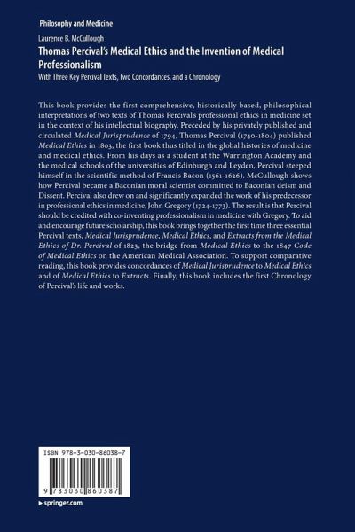 Preface.- Acknowledgements.- Part I: Thomas Percival's Medical Ethics and the Invention of.- Medical Professionalism.- Chapter 1: What Percival Inherits: John Gregory's Moral Revolution against the Long Tradition of Entrepreneurial Medicine in the History of Western Medicine.- Chapter 2.- An Intellectual Biography of Thomas Percival.- Chapter 3: Thomas Percival Joins Gregory's Moral Revolution against the Long Tradition of Entrepreneurial Medicine in the History of Western Medicine.- Chapter 4: The Place of Percival's Medical Ethics in the History of Medical Ethics.- Bibliography.- Part II: Three Key Percival Texts - Medical Ethics, Medical Jurisprudence, and Extracts - Two Concordances, and a Chronology.- Three Texts.- Concordance of Medical Jurisprudence with Medical Ethics.- Concordance of Medical Ethics with the Extracts.- Chronology of Thomas Percival's Life and Works.- Index.