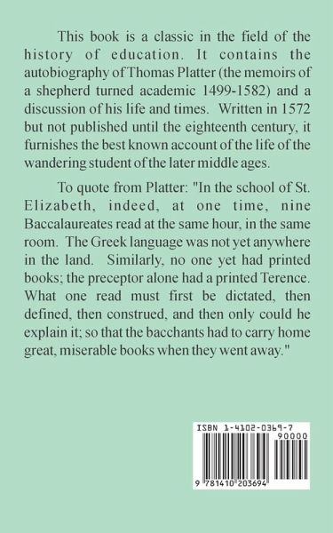 This book is a classic in the field of the history of education. It contains the autobiography of Thomas Platter (the memoirs of a shepherd turned academic 1499-1582) and a discussion of his life and times. Written in 1572 but not published until the eighteenth century, it furnishes the best known account of the life of the wandering student of the later middle ages. To quote from Platter: "In the school of St. Elizabeth, indeed, at one time, nine Baccalaureates read at the same hour, in the same room. The Greek language was not yet anywhere in the land. Similarly, no one yet had printed books; the preceptor alone had a printed Terence. What one read must first be dictated, then defined, then construed, and then only could he explain it; so that the bacchants had to carry home great, miserable books when they went away."