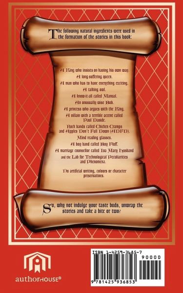 The following natural ingredients were used in the formation of the stories in this book: A King who insists on having his own way. A long-suffering queen. A man who has to have everything exciting. A talking owl. A know-it-all called Manual. An unusually wise Bob. A princess who argues with the King. A villain with a terrible accent called Paul Daside. Rock bands called Chicken Cramps and Apples Don't Fall Down (ADFD). Mind reading glasses. A boy band called Boy Fluff. A marriage counsellor called Iva Mary Husband and the Lab for Technological Peculiarities and Phenomena. No artificial writing, colours or character preservatives. So, why not indulge your taste buds, unwrap the stories and take a bite or two?