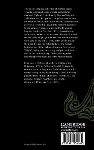 This book contains a collection of political verses, venality satires and songs of social protest from medieval England. First edited by Thomas Wright in 1839, these so called 'political songs' are reissued here on behalf of the Royal Historical Society. The collection provides a fascinating insight into medieval responses to contemporary events. A new and wide-ranging introduction from Peter Coss offers observation on authorship, audience, the means of dissemination and the use of the languages involved. The reader is brought up to date on the critical study of the poems and on their significance and potentiality for the modern historian and literary scholar. Professor Coss corrects Wright's dating where necessary and puts each item into its full contemporary context, making these fascinating verses accessible to the modern reader.