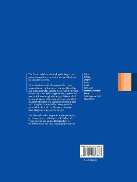 The thoraco-abdominal aortic pathology is not uncommon and represents the ultimate challenge for vascular surgeons. The book deals with the newest endovascular and hybrid approaches, together with more traditional surgical strategies. Written by internationally renowned experts in vascular and cardiac surgery, anesthesiology and radiology, the volume provides a very practical approach to the main problems encountered from diagnosis to postoperative care: general principles of aortic diseases, imaging techniques, surgical and anesthesiologic strategies and techniques and other specific problems are some of the topic dealt with. Numerous pictures illustrate the most important diagnostic findings and depict key techniques and strategies. Vascular and cardiac surgeons, anesthesiologists, perfusionists and radiologists will find in this volume useful and updated information for the treatment of this very challenging condition.