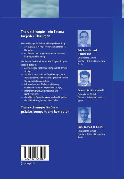 I Diagnostik und präoperative Vorbereitung.- 1 Differentialdiagnose des Lungenrundherdes und präoperative Abklärung.- 2 Radiologische Standarddiagnostik und moderne Schnittbildverfahren.- 3 Präoperative Risikoabschätzung und adäquate Vorbereitung in der Thoraxchirurgie.- 4 Perioperative Schmerztherapie.- II Instrumentarium und spezielle Techniken.- 5 Thoraxchirurgisches Instrumentarium und Nahtmaterial (inkl. MIC).- 6 Zugangswege zum Thorax und spezielle Nahttechniken (Bronchus, Pulmonalarterie), Tipps und Tricks.- 7 Thoraxdrainage: Technik, Tipps und Tricks.- 8 Tracheostomie: Technik, Tipps und Tricks.- III Thorakale Notfälle.- 9 Operationsindikation und Strategie beim stumpfen und penetrierenden Trauma.- 10 Stadienadaptierte chirurgische Therapie des Pleuraempyems.- 11 Spontanpneumothorax.- IV Neoplasien (Lungenrundherd, Lungenmetastasen, Bronchialkarzinom).- 12 Epidemiologie, Metastasierungsmuster und Prognosefaktoren bei Lungenmetastasen.- 13 Operationsindikation und operative Verfahrenswahl bei Lungenmetastasen.- 14 Epidemiologie, Genese, Metastasierung und Prognosefaktoren beim Bronchialkarzinom.- 15 Prätherapeutisches Staging des Bronchialkarzinoms.- 16 Videoassistierte Resektion beim Lungenrundherd.- 17 Operationsindikation und operative Technik beim Bronchialkarzinom.- 18 Multimodale und palliative Therapie des Bronchialkarzinoms.- V Thorakale Komplikationen nach chirurgischen Eingriffen und Mediastinitis.- 19 Nosokomiale Pneumonie und Langzeitbeatmung.- 20 Differentialdiagnostik und Therapie der Mediastinitis.