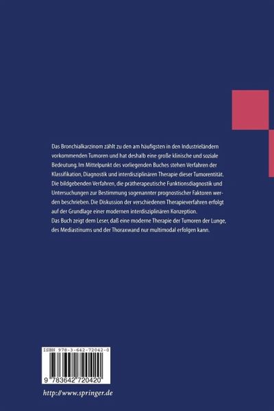 Das Bronchialkarzinom zählt zu den am häufigsten in den Industrieländern vorkommenden Tumoren und hat deshalb eine große klinische und soziale Bedeutung. Im Mittelpunkt des vorliegenden Buches stehen Verfahren der Klassifikation, Diagnostik und interdisziplinären Therapie dieser Tumorentität. Die bildgebenden Verfahren, die prätherapeutische Funktionsdiagnostik und Untersuchungen zur Bestimmung sogenannter prognostischer Faktoren werden beschrieben. Die Diskussion der verschiedenen Therapieverfahren erfolgt auf der Grundlage einer modernen interdisziplinären Konzeption. Das Buch zeigt dem Leser, daß eine moderne Therapie der Tumoren der Lunge, des Mediastinums und der Thoraxwand nur multimodal erfolgen kann.