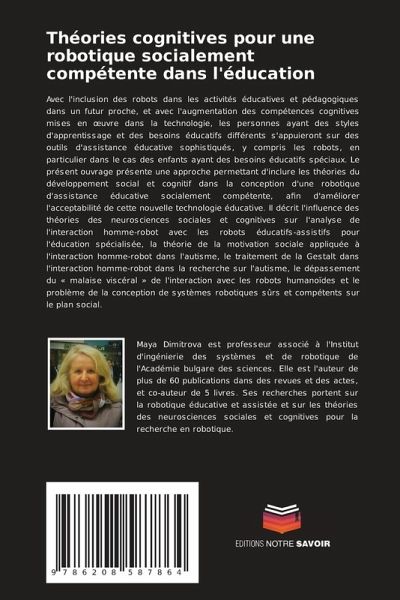 Avec l'inclusion des robots dans les activités éducatives et pédagogiques dans un futur proche, et avec l'augmentation des compétences cognitives mises en oeuvre dans la technologie, les personnes ayant des styles d'apprentissage et des besoins éducatifs différents s'appuieront sur des outils d'assistance éducative sophistiqués, y compris les robots, en particulier dans le cas des enfants ayant des besoins éducatifs spéciaux. Le présent ouvrage présente une approche permettant d'inclure les théories du développement social et cognitif dans la conception d'une robotique d'assistance éducative socialement compétente, afin d'améliorer l'acceptabilité de cette nouvelle technologie éducative. Il décrit l'influence des théories des neurosciences sociales et cognitives sur l'analyse de l'interaction homme-robot avec les robots éducatifs-assistifs pour l'éducation spécialisée, la théorie de la motivation sociale appliquée à l'interaction homme-robot dans l'autisme, le traitement de la Gestalt dans l'interaction homme-robot dans la recherche sur l'autisme, le dépassement du « malaise viscéral » de l'interaction avec les robots humanoïdes et le problème de la conception de systèmes robotiques sûrs et compétents sur le plan social.