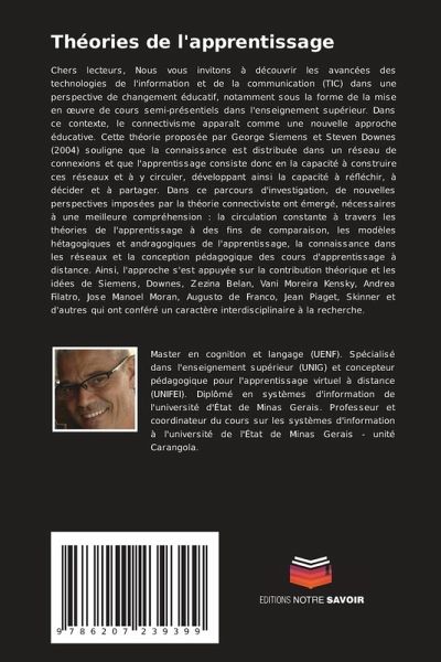 Chers lecteurs, Nous vous invitons à découvrir les avancées des technologies de l'information et de la communication (TIC) dans une perspective de changement éducatif, notamment sous la forme de la mise en oeuvre de cours semi-présentiels dans l'enseignement supérieur. Dans ce contexte, le connectivisme apparaît comme une nouvelle approche éducative. Cette théorie proposée par George Siemens et Steven Downes (2004) souligne que la connaissance est distribuée dans un réseau de connexions et que l'apprentissage consiste donc en la capacité à construire ces réseaux et à y circuler, développant ainsi la capacité à réfléchir, à décider et à partager. Dans ce parcours d'investigation, de nouvelles perspectives imposées par la théorie connectiviste ont émergé, nécessaires à une meilleure compréhension : la circulation constante à travers les théories de l'apprentissage à des fins de comparaison, les modèles hétagogiques et andragogiques de l'apprentissage, la connaissance dans les réseaux et la conception pédagogique des cours d'apprentissage à distance. Ainsi, l'approche s'est appuyée sur la contribution théorique et les idées de Siemens, Downes, Zezina Belan, Vani Moreira Kensky, Andrea Filatro, Jose Manoel Moran, Augusto de Franco, Jean Piaget, Skinner et d'autres qui ont conféré un caractère interdisciplinaire à la recherche.