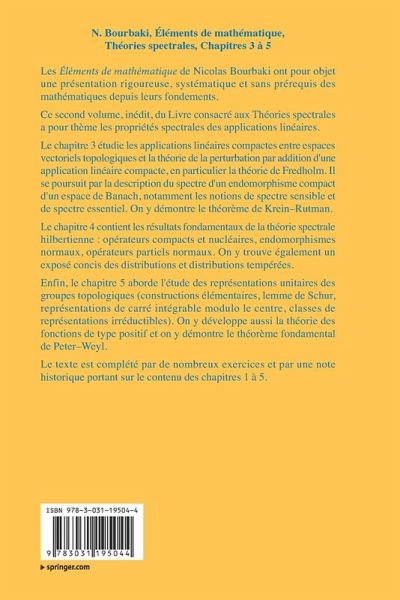 Le chapitre 4 contient les résultats fondamentaux de la théorie spectrale hilbertienne : opérateurs compacts et nucléaires, endomorphismes normaux, opérateurs partiels normaux. On y trouve également un exposé concis des distributions et distributions tempérées.