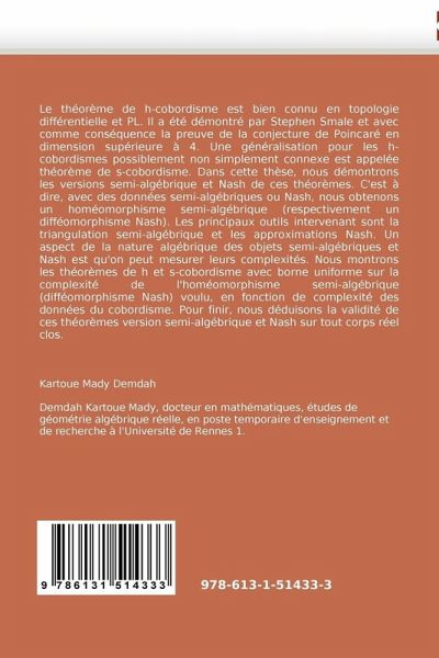 Le théorème de h-cobordisme est bien connu en topologie différentielle et PL. Il a été démontré par Stephen Smale et avec comme conséquence la preuve de la conjecture de Poincaré en dimension supérieure à 4. Une généralisation pour les h-cobordismes possiblement non simplement connexe est appelée théorème de s-cobordisme. Dans cette thèse, nous démontrons les versions semi-algébrique et Nash de ces théorèmes. C''est à dire, avec des données semi-algébriques ou Nash, nous obtenons un homéomorphisme semi-algébrique (respectivement un difféomorphisme Nash). Les principaux outils intervenant sont la triangulation semi-algébrique et les approximations Nash. Un aspect de la nature algébrique des objets semi-algébriques et Nash est qu''on peut mesurer leurs complexités. Nous montrons les théorèmes de h et s-cobordisme avec borne uniforme sur la complexité de l''homéomorphisme semi-algébrique (difféomorphisme Nash) voulu, en fonction de complexité des données du cobordisme. Pour finir, nous déduisons la validité de ces théorèmes version semi-algébrique et Nash sur tout corps réel clos.